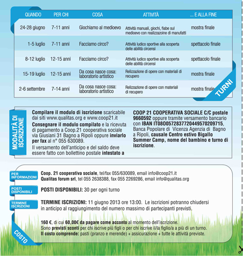 Qualitas insieme a Coop 21 e Le Rifiorenze organizzano nel verde del giardino medioevale dell’Antico Spedale del Bigallo a Bagno a Ripoli centri estivi per bambini e ragazzi dai 7 ai 15 anni.