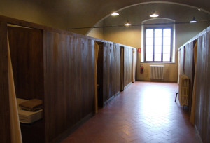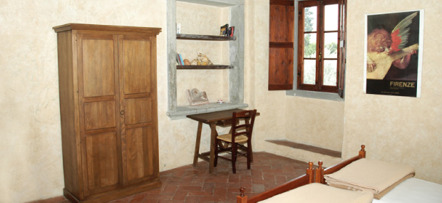 The luminous dormitories of the hostel are an ideal solution for organized groups, but also for families given their spaciousness and comfort. There are two dormitories in the hostel one sleeps 5 and the other 8. Each bed has its own storage space (locks can be requested at the front desk). Each dormitory is equipped with private bathroom with showers. TThe hostel offers 6 double rooms (with the possibility to add one or more single beds), all equipped with private bathrooms. Sleeping in the alcoves is without a doubt the most unique solution that the Bigallo Hostel offers. It is inspired by monks, that traditionally slept in small wooden alcoves. The hostel offers 20 beds in the wooden alcoves with two single beds in each creating a spacious and luminous dormitory.